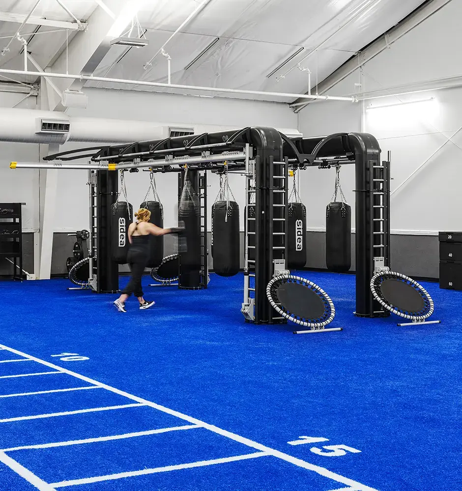 We custom-designed this structure to include opportunities for a solo or group workout. Implements include boxing bags, gym ladders, lat bar twins, plyo boards, barbell levers, ball trampolines, training ladders, suspension bands and gym ropes.